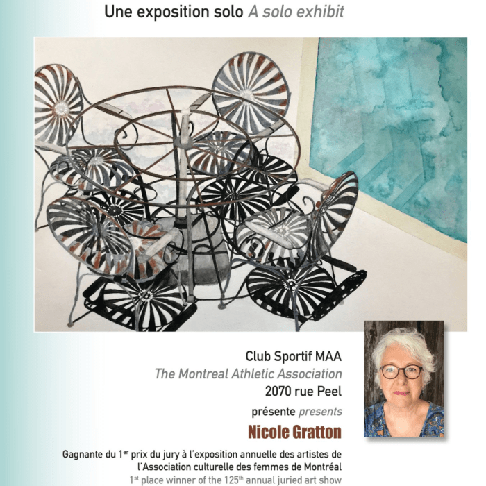 La retraite venue, Nicole décide de reprendre sa formation artistique. Elle découvre alors le bonheur de peindre et choisi l’aquarelle, le médium qui s’apparente le mieux selon elle au travail du verre par sa transparence et sa luminosité. Nicole poursuivra sa formation durant cinq ans au Centre des arts visuels. Aujourd’hui elle parfait ses connaissances en participant régulièrement à des ateliers de création artistique.